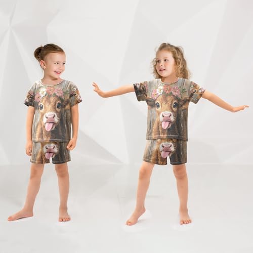 ALAZA Wooden Cow Flower Pajamas Set Short Sleeve Cotton Sleepwear Summer Pjs 2 Piece 5-14Y 1
