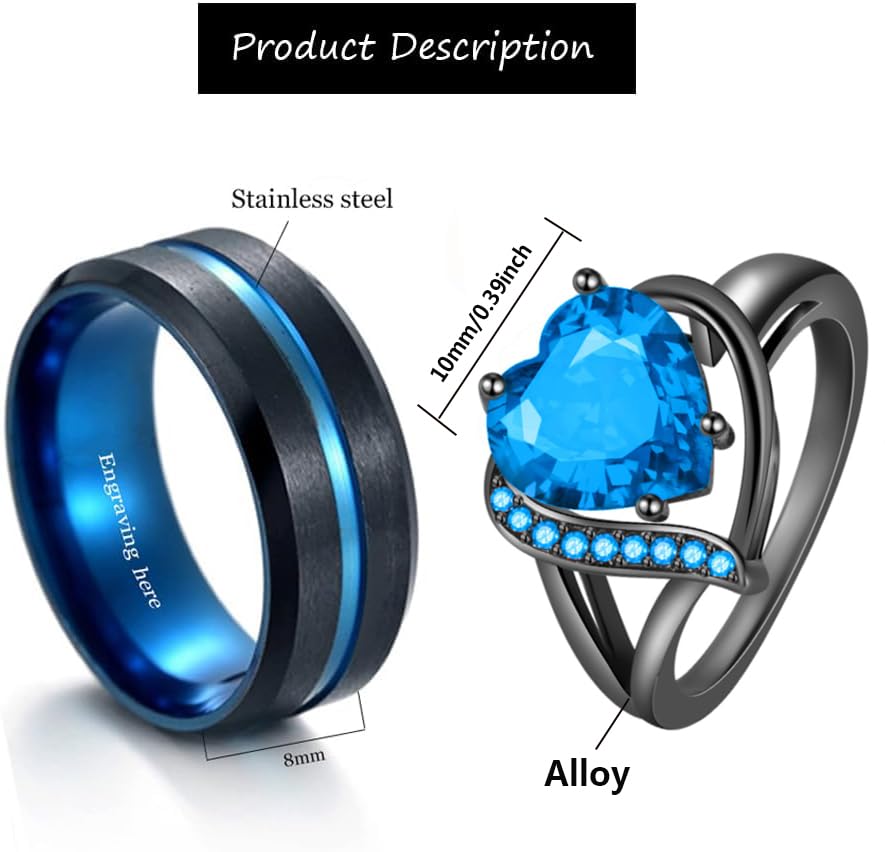 Personalized Promise Rings for Couples Matching Wedding Rings Set for Him and Her Blue Stainless Steel Engagement Rings 4