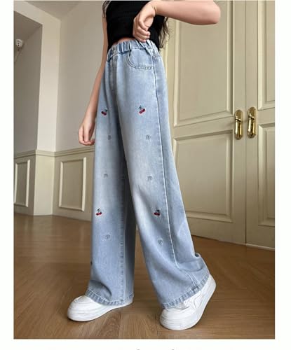 Girls Jeans Cute Embroidered Denim Pants Ribbed Elastic Waist Casual Baggy Wide Leg Pants,5-13 Years 5