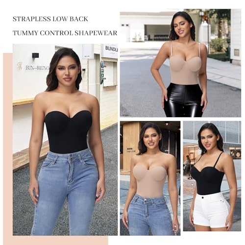 SHAPERIN Women's Tummy Control Shapewear Bodysuits Strapless Low Back Body Shaper with Built-in Bra & Removable Straps 2