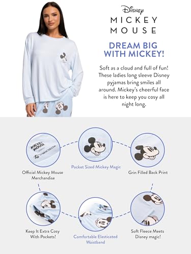 • Adorable Mickey Mouse Details: These light blue women’s pjs showcase a cute Mickey Mouse side profile on the chest pocket and back of the neck. The bottoms feature a fun, full-coverage Mickey face pattern, making these Mickey Mouse pajamas for women both stylish and playful. Complete with two handy waist pockets for added versatility