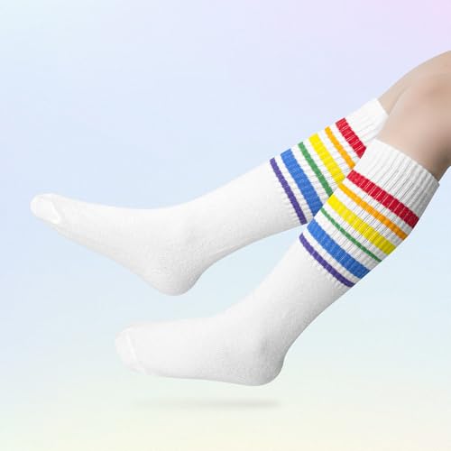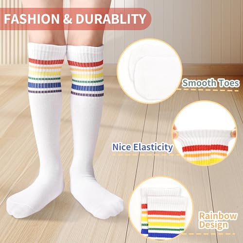• 4 PAIRS: This set consists of 4 pairs of girls socks, two of which are black and white bow knee high socks, and the other two are white long socks with rainbow stripes