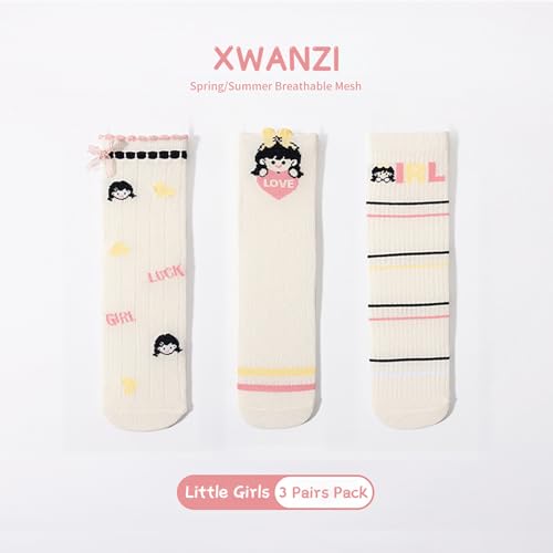 Girls Socks Ribbed Cuffs Keen High Crew Socks Cartoon Bow Flower Mesh Knit Cotton Colorful Socks for Girls 3 Pairs 7