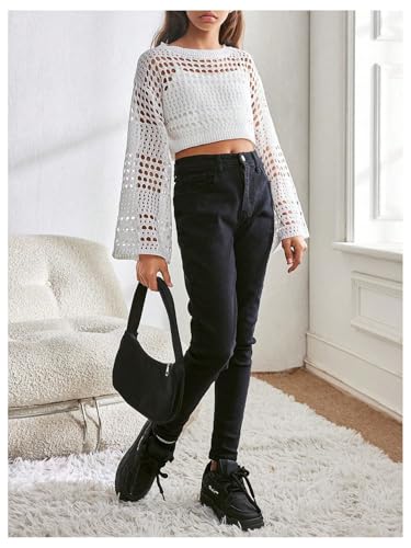 More information about GORGLITTER Girl's Hollow Out Cropped Sweater Boat Neck Long Sleeve Crochet Top Drop Shoulder Pullover Tops