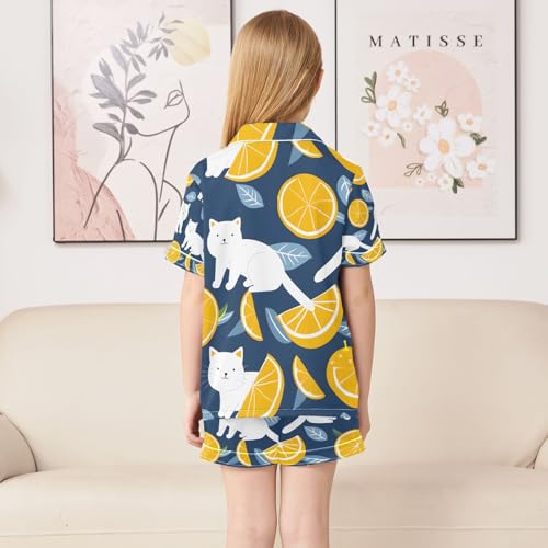 HOT ! senya Cat on Lemon Background Satin Summer Pajama Sets Silk Short Sleeve Button Down Sleepwear