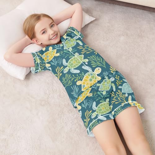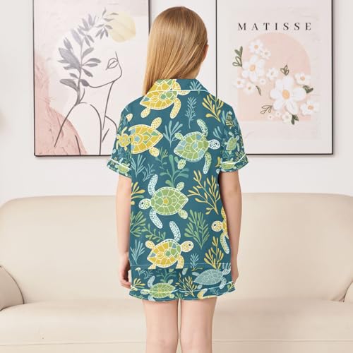 senya Sea Turtle in Aqua Satin Summer Pajama Sets Silk Short Sleeve Button Down Sleepwear 5