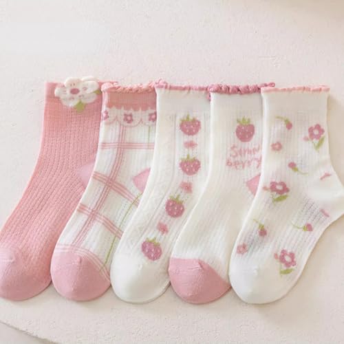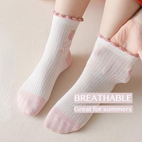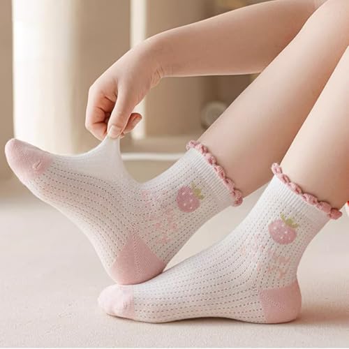 More information about 5 Pairs Girls Thin Spring Summer Cotton Mesh Ankle Socks, Breathable Cute Strawberry Trim Princess Mid-Calf Socks