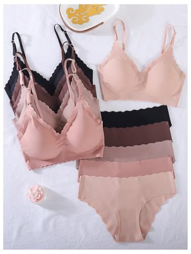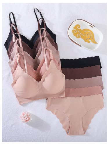 • Seamless underwear for women featured with scallop trim, plain color, adjustable strap, low waist, 5pcs wireless bralette tops and 5pcs high waist panties, comfy and briefs set