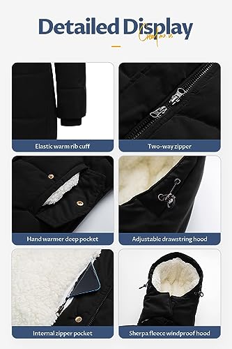 • The Durable Jacket Feels Like a Big Warm Hug: With lightweight down insulation,mid-thigh length and a soft furry hood,super soft sherpa warm lining.Keep snow out and enhance warmth.Keep warm when Temps drop below freezing(warm without being bulky and heavy.)