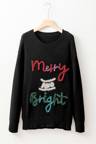 HOT ! Women's Black Tinsel Merry and Bright Graphic Christmas Sweater