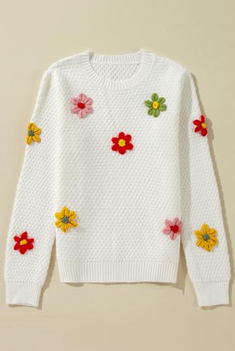 Women's White Colorful Flower Applique Textured Knit Sweater 7