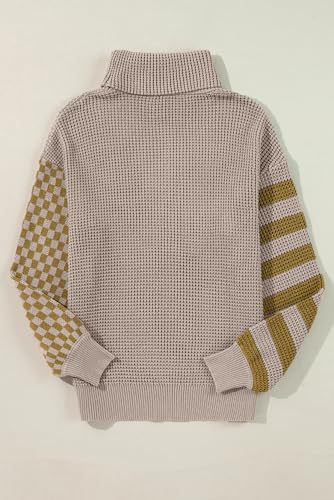 More information about Women's Smoke Gray Striped Plaid Patchwork Waffle Knit Turtleneck Sweater