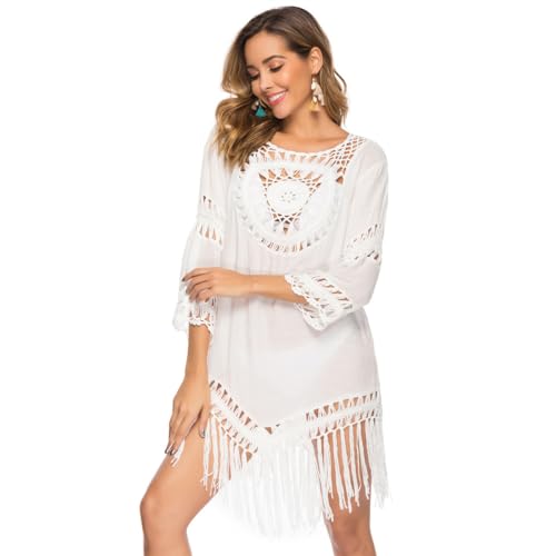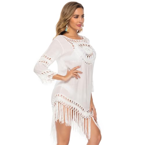 LWBTOSEE Swimsuit Coverups for Women Beach Dresses Beachwear Crochet Bikini with Loose Tassels (White) 1