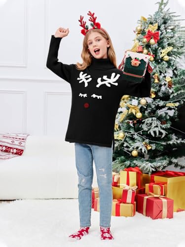 Haloumoning Girls Christmas Sweater Kids Oversized Turtleneck Cute Reindeer Sweaters with Side Slit 4