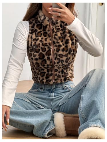 Women's Y2k Leopard Print Cropped Vest Jacket Zip Up Fuzzy Sleeveless Cheetah Outwear 4