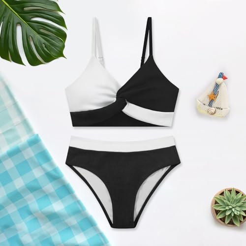 HOT ! Weixinbuy Girls' Swimsuit Kid Two-Piece V-Neck Bikini Set Spaghetti Strap Twist Cross Bathing Suit Swimwear Size 13-14 White and Black