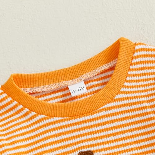 Newborn Baby Boy Halloween Outfit Fall Clothes Long Sleeve Striped Waffle Pumpkin Sweatshirt Bubble Romper 6