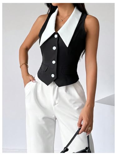 HOT ! MakeMeChic Women's Colorblock Suit Vest Button Down Sleeveless Work Outerwear Waistcoat
