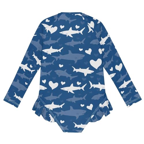ALAZA White Shark Fish Heart Blue Girls One Piece Swimsuit Long Sleeve Rash Guard Swimsuits UV 50+ Swimwear Zipper 1