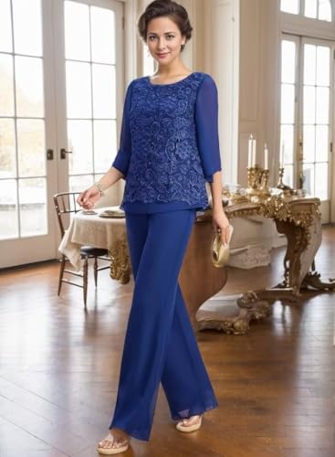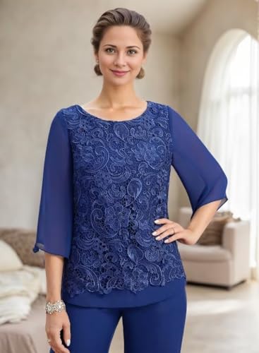 2 Pieces Mother of The Bride Pant Suits Lace Appliques Chiffon Wedding Pantsuits for Women Dressy 3